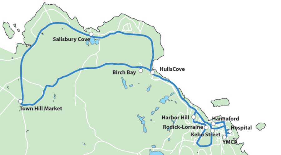 | HULLS COVE | SALISBURY COVE | TOWN HILL | BIRCH BAY | HANNA FORD | YMCA | HOSPITAL |